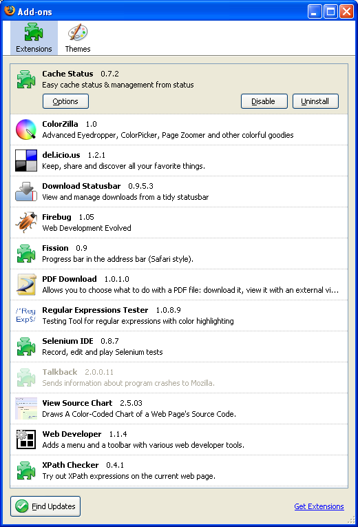 Firefox Extensions ColorZila del.icio.us Download Statusbar Firebug Fission PDF Download Regular Expression Tester Selenium IDE Talkback View Source Chart Web Developer XPath Checker Tweet