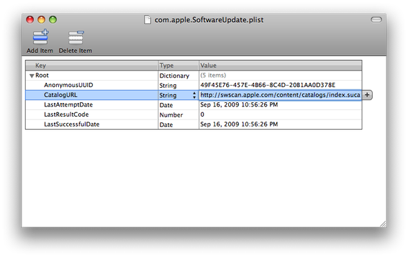 Ná pagina de suporte da apple, onde descreve para configurar conforme descrevi acima, tinha o que eu queria que era o endereço para o catalogo, mas o bendito arquivo /etc/swupd/swupd.plist não existia. Como faz? Busca prá lá… busca pra cá… Até que cheguei em outra página que explica como configurar o Software update sem o Open Directory, onde cheguei até o arquivo /Library/Preferences/com.apple.SoftwareUpdate.plist, no qual era só trocar o endereço do atributo CatalogURL para um servidor local, mas eu queria trocar para o servidor original, logo…